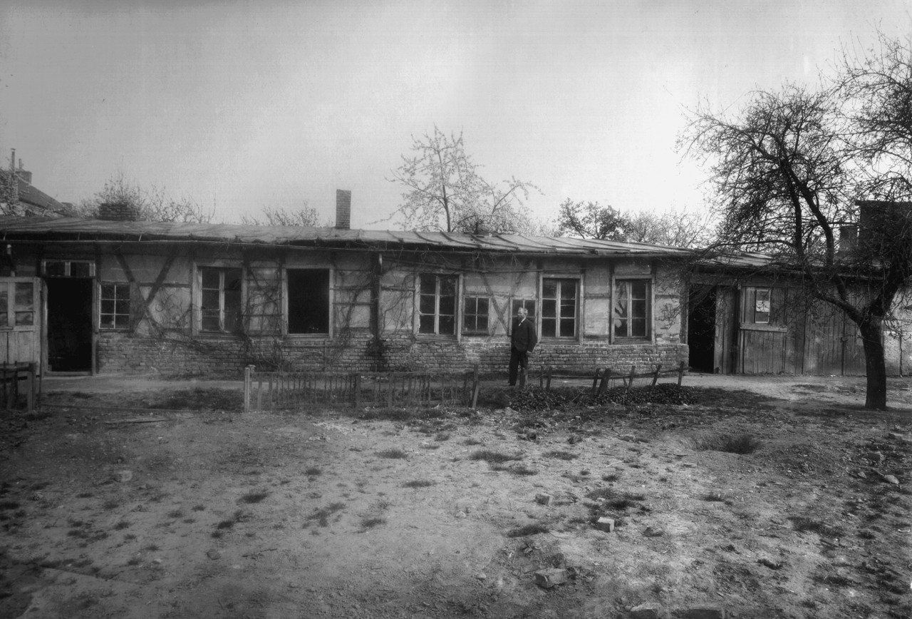 Nächstes Bild Soennecken, Baracke Reuterstraße Soenneckens erste Werkstatt hinter den Häusern Reuterstr. 10-12 (1883). Vor der Werkstatt Friederich Soennecken. Bildquelle: Stadtmuseum Bonn.